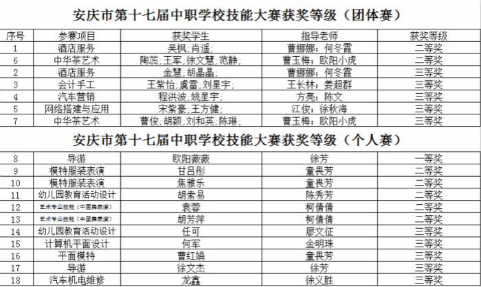 近日,安慶市第十七屆中職學(xué)校技能大賽成績(jī)揭曉,安慶皖江中等專(zhuān)業(yè)學(xué)校再獲佳績(jī),共有12 項(xiàng) 30人次獲獎(jiǎng),其中一等獎(jiǎng)1個(gè)1人次,二等獎(jiǎng)7個(gè)11人次,三等獎(jiǎng)10個(gè)18人次,獲獎(jiǎng)率達(dá)78.95%。