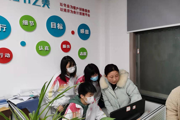 第二天,部分學生代表來到協(xié)成財務咨詢有限公司參觀、座談,三人一組在師傅帶領下上機操作,現(xiàn)場體驗真實的財務和稅收系統(tǒng)。