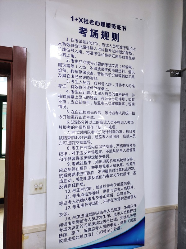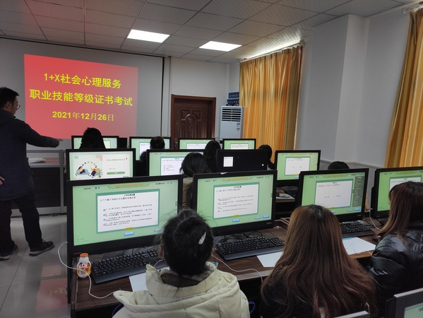 12月25日和12月26日下午,安慶職業(yè)技術學院管理服務學院“1+X”社會心理服務(中級)職業(yè)技能等級證書認證考試在圖文信息中心508、509機房順利舉行,2019級、2020級幼兒發(fā)展與健康管理專業(yè)共計100名同學參加了考試。考試期間,實訓中心李進恩主任、管理服務學院院長高潤霞、副院長楊厚松現(xiàn)場督導考務工作。