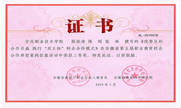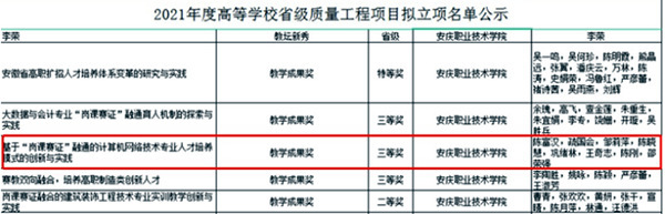 合作4年來,校企聯(lián)合開發(fā)基于工作過程項目化教材9種,并正式出版發(fā)行,推進(jìn)了校企合作專業(yè)教學(xué)內(nèi)容創(chuàng)新;雙方共同申報的“優(yōu)勢互補合作共贏踐行‘雙主體’校企合作模式”在安徽省第五屆校企合作典型案例征集活動中榮獲三等獎;通過校企聯(lián)合委派指導(dǎo)教師輔導(dǎo)學(xué)生參加各類職業(yè)技能大賽,榮獲安徽省職業(yè)技能大賽一等獎2項,二等獎3項,三等獎8項的好成績;為進(jìn)一步深化學(xué)生德育教育,2019年校企雙方黨組織共建“思政實踐教育基地”在學(xué)生的素質(zhì)教育方面獲得多方認(rèn)可;在2021年度安慶職業(yè)技術(shù)學(xué)院優(yōu)秀人才培養(yǎng)方案評選中,校企共建計算機(jī)網(wǎng)絡(luò)技術(shù)專業(yè)人才培養(yǎng)方案獲得一等獎;雙方共同研究的“基于‘崗課賽證’融通的計算機(jī)網(wǎng)絡(luò)技術(shù)專業(yè)人才模式的創(chuàng)新與實踐”榮獲安徽省教學(xué)成果獎三等獎。一項項獎牌,一項項榮譽,一項項成果充分體現(xiàn)了校企合作成果,推進(jìn)了職業(yè)教育創(chuàng)新發(fā)展步伐。(文、圖:陳 剛 審核:疏國會)