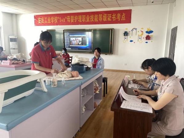2022年6月11日上午教育部1+X母嬰護理職業(yè)技能等級證書考試在安慶專業(yè)學(xué)校實訓(xùn)樓舉行。本次考試由教育部認證的第三方機構(gòu)——山東陽光大姐服務(wù)有限公司考評站與工業(yè)學(xué)校共同負責(zé)實施,圓滿完成了 36名學(xué)前教育專業(yè)在校學(xué)生的考證工作??紕?wù)安排井然有序,得到了考評領(lǐng)導(dǎo)和專家的一致好評。