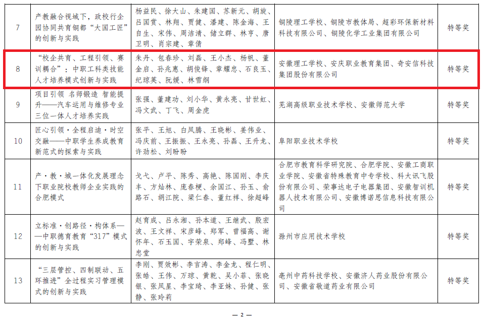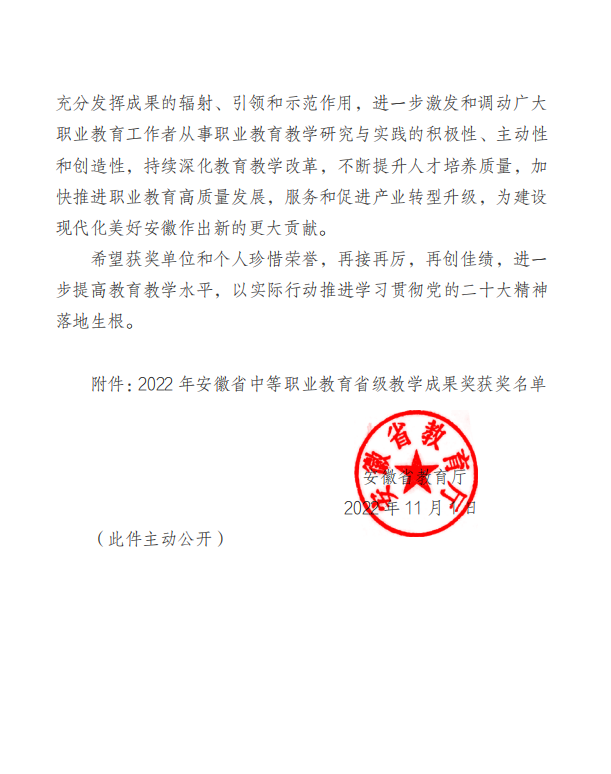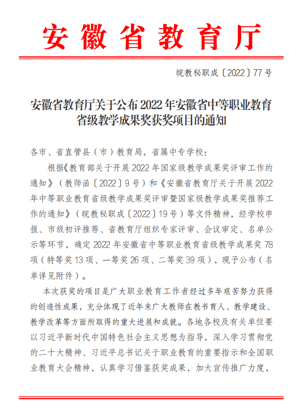 近日,安徽省教育廳公布了標(biāo)志著全省中等職業(yè)教育教學(xué)最高水平的2022年安徽省教學(xué)成果獎(jiǎng)評(píng)選結(jié)果。根據(jù)安徽省教育廳下發(fā)的《安徽省教育廳關(guān)于公布 2022 年安徽省中等職業(yè)教育省級(jí)教學(xué)成果獎(jiǎng)獲獎(jiǎng)項(xiàng)目的通知》(皖教秘職成〔2022〕77 號(hào))文件,安徽理工學(xué)校報(bào)送的兩項(xiàng)教學(xué)成果分別獲得特等獎(jiǎng)、一等獎(jiǎng),安慶工業(yè)學(xué)校報(bào)送的教學(xué)成果獲得一等獎(jiǎng)。