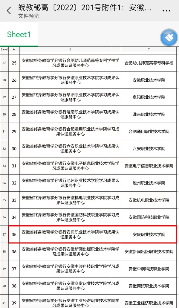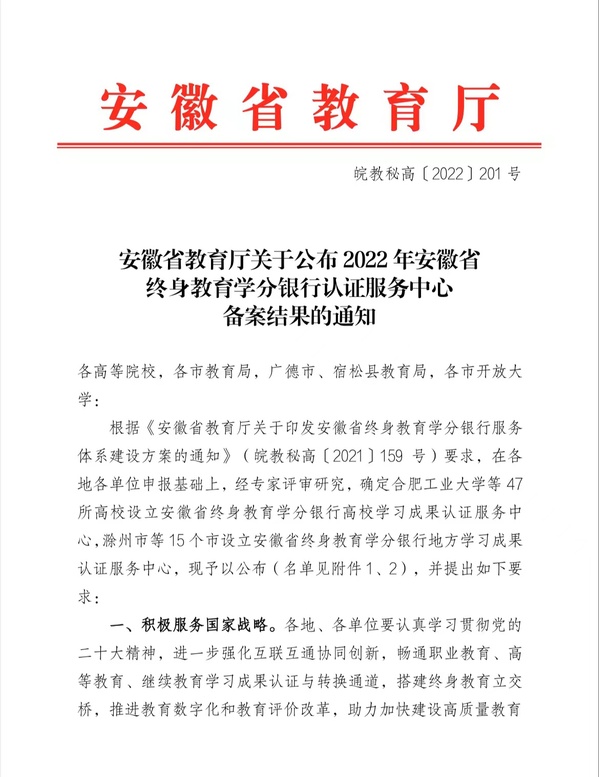 近日,省教育廳公布了首批安徽省終身教育學分銀行高校學習成果認證服務中心名單,安慶職業(yè)技術(shù)學院成功入選。