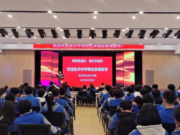 3月8日,懷寧東升中學的120余名師生到安慶職業(yè)技術(shù)學院開展參觀研學活動。同學們通過聆聽講座、參觀體驗安慶職院的教學和實訓場地,詳細了解該校各專業(yè)的建設(shè)情況介紹,幫助他們樹立初步的職業(yè)生涯規(guī)劃。