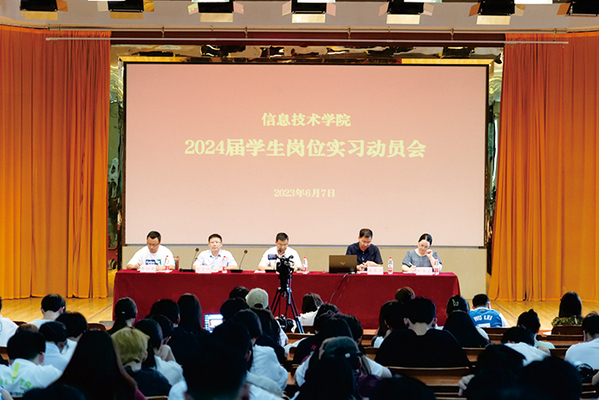 為落實學(xué)校關(guān)于畢業(yè)生崗位實習(xí)管理規(guī)定,強化實習(xí)管理,確保實習(xí)質(zhì)量,6月7日下午,安慶職業(yè)技術(shù)學(xué)院信息技術(shù)學(xué)院2024屆畢業(yè)生崗位實習(xí)動員暨就業(yè)招聘會隆重舉行。主會場設(shè)在圖文信息中心一樓報告廳,二號教學(xué)樓216報告廳、各智慧教室設(shè)分會場,學(xué)生通過網(wǎng)絡(luò)直播同步收看。信息技術(shù)學(xué)院內(nèi)設(shè)機構(gòu)負責(zé)人、專業(yè)建設(shè)負責(zé)人、相關(guān)輔導(dǎo)員及2024屆927名畢業(yè)生參加了動員會。該院黨總支書記、院長疏國會出席會議并講話,黨總支副書記陳富漢參加會議,副院長熊祖濤主持會議。