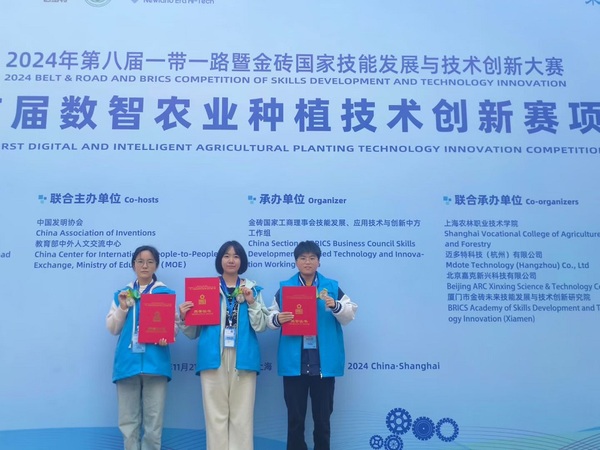 數(shù)智農(nóng)業(yè)種植技術(shù)創(chuàng)新賽項包括虛擬仿真和實操兩部分,涵蓋了農(nóng)作物種植管理過程中的全方位知識,貼近生產(chǎn)實際,選手需要模擬農(nóng)業(yè)生產(chǎn)過程的種植布局、水肥管理、病蟲害防控、采收收獲4個環(huán)節(jié)。經(jīng)過激烈角逐,植保專業(yè)的宋蕊、陳佳莉、宋舒靜組成的參賽隊獲得二等獎,指導(dǎo)老師李萍和許慧慧被評為優(yōu)秀指導(dǎo)教師,學(xué)校獲優(yōu)秀組織獎。張南和丁晨指導(dǎo)的王曉慧、徐曉萱、朱雪英組成的參賽隊伍榮獲三等獎。