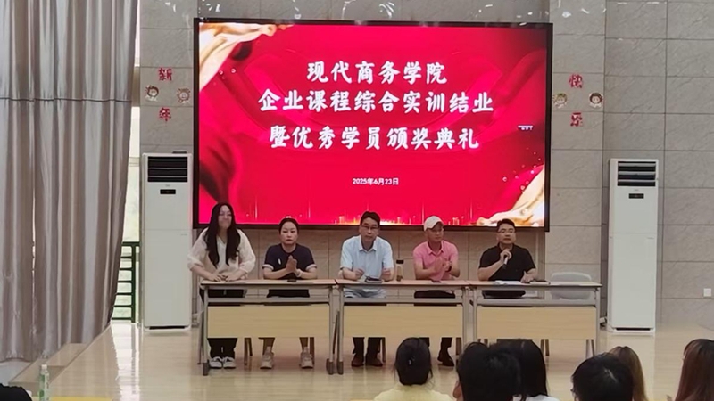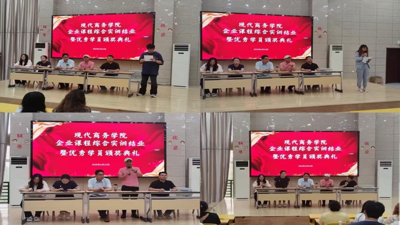 6月23日下午,安慶職業(yè)技術學院現代商務學院舉行上半年企業(yè)綜合實訓課程結業(yè)暨優(yōu)秀學員頒獎典禮?,F代商務學院院長金啟勝,安徽云霽電商公司負責人、安徽省產業(yè)教授汪義德,學院教學工作負責人、學生工作負責人、教師代表以及參加本次實訓課程的全體學生共同出席。該院學生工作負責人主持。